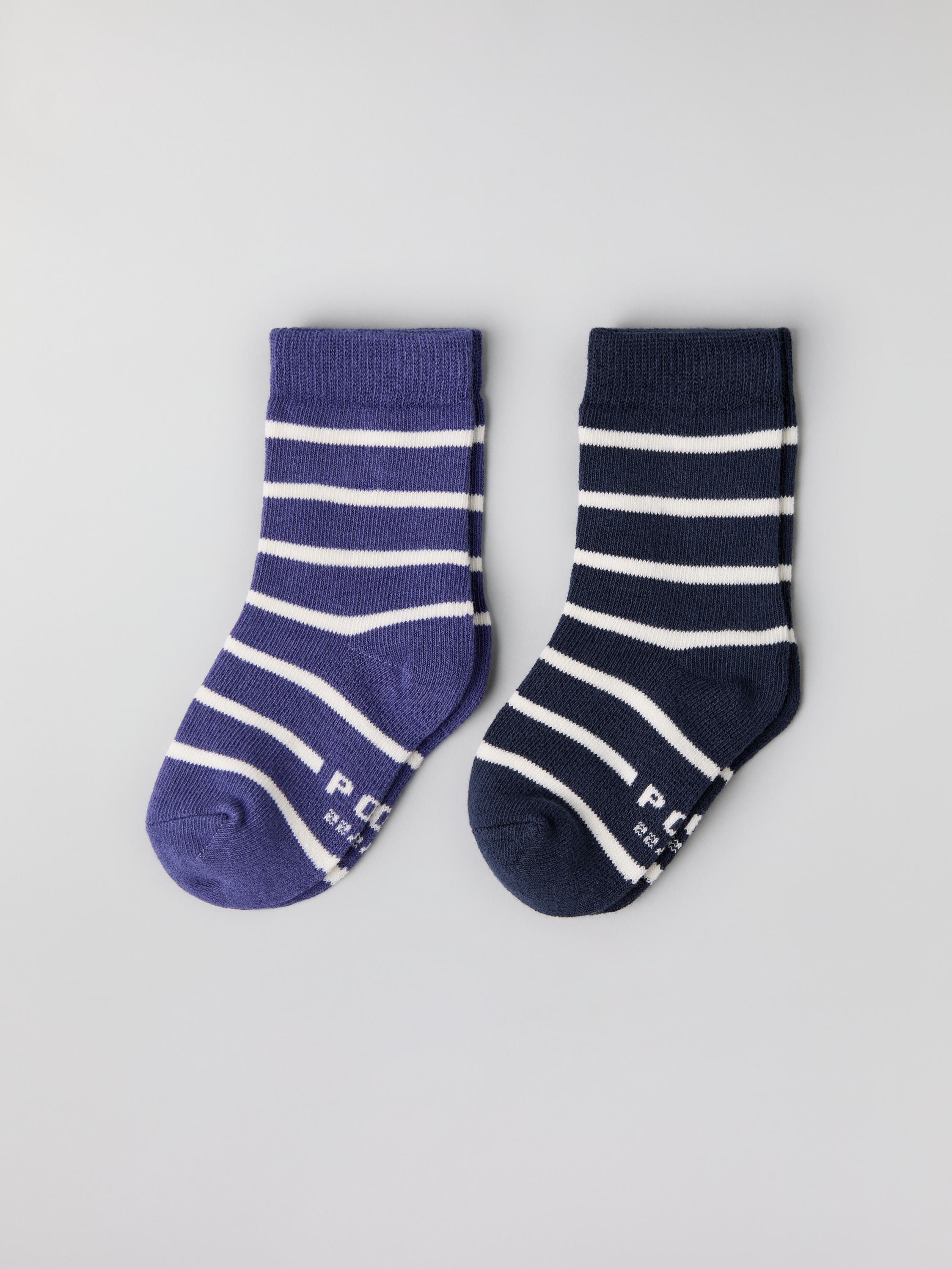 Ett praktiskt 2-pack med klassiskt randiga strumpor för barn, tillverkade i mjuk ekologisk bomull. Storleken är tydligt markerad på insidan av skaftet, där det även finns plats för att skriva barnets namn.
