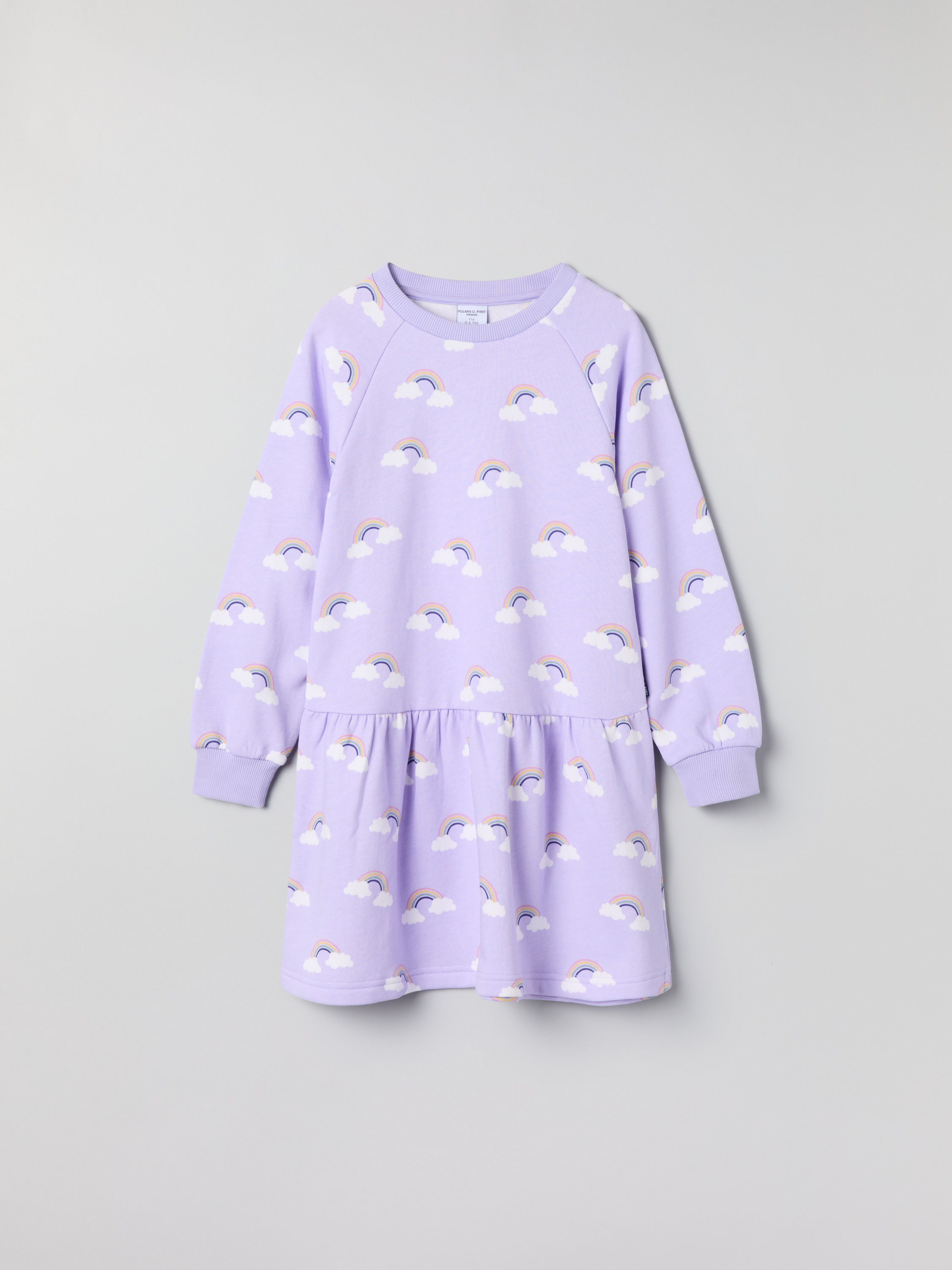 Denna klänning är tillverkad i mjuk sweatshirtkvalitet av 100% ekologisk bomull. Klänningen har ett lekfullt regnbågsmönster och ribbade muddar i halsringning och ärmslut. Kjoldelen är rynkad och storlekarna 86-92 har knappar bak på axeln för att underlätta klädbyten.