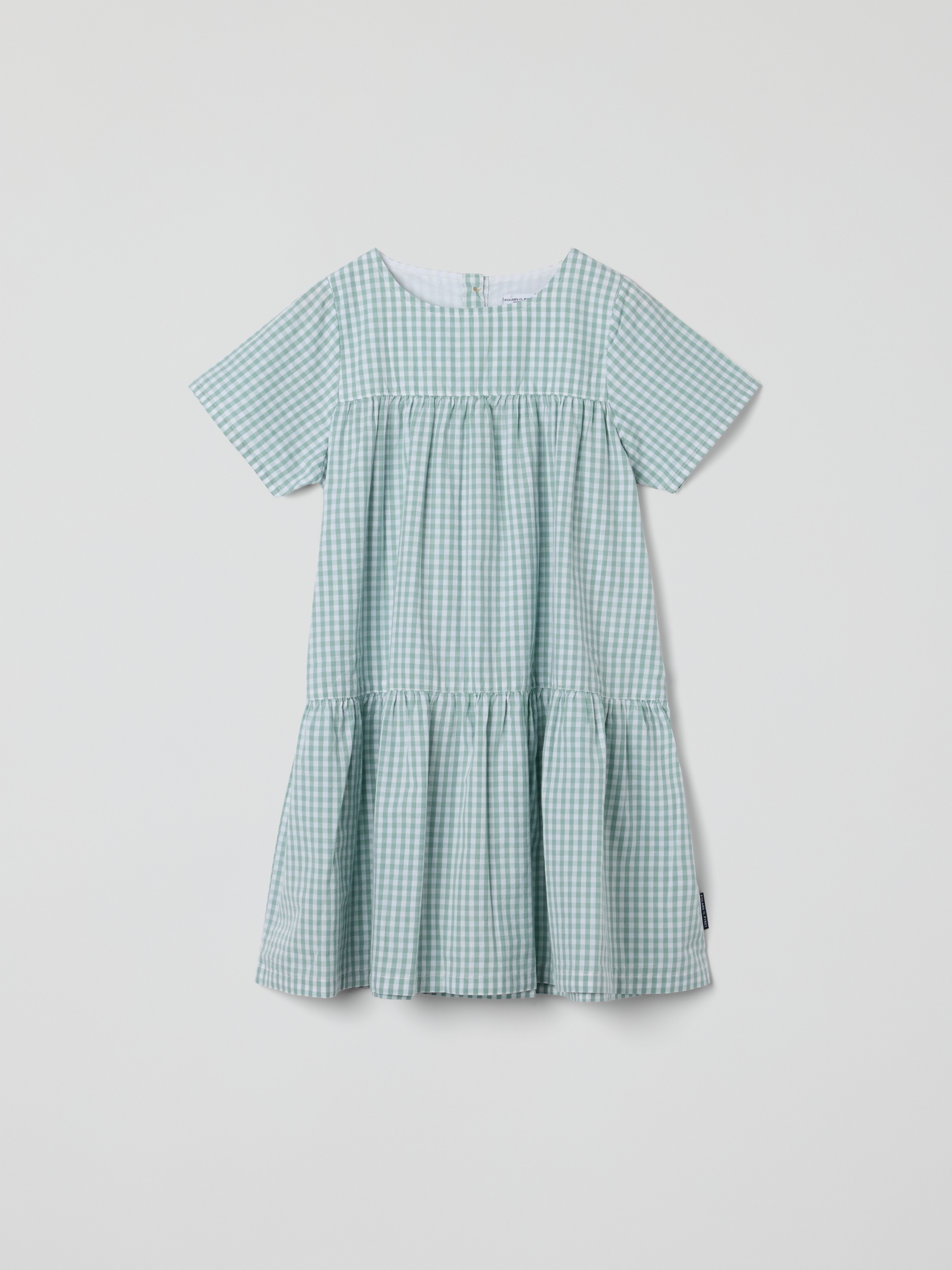 En söt, kortärmad klänning med rutigt mönster, tillverkad i mjuk ekologisk bomull. Klänningen har en ledig passform och knäpps med knappar i ryggen, vilket gör den enkel att ta på och av.