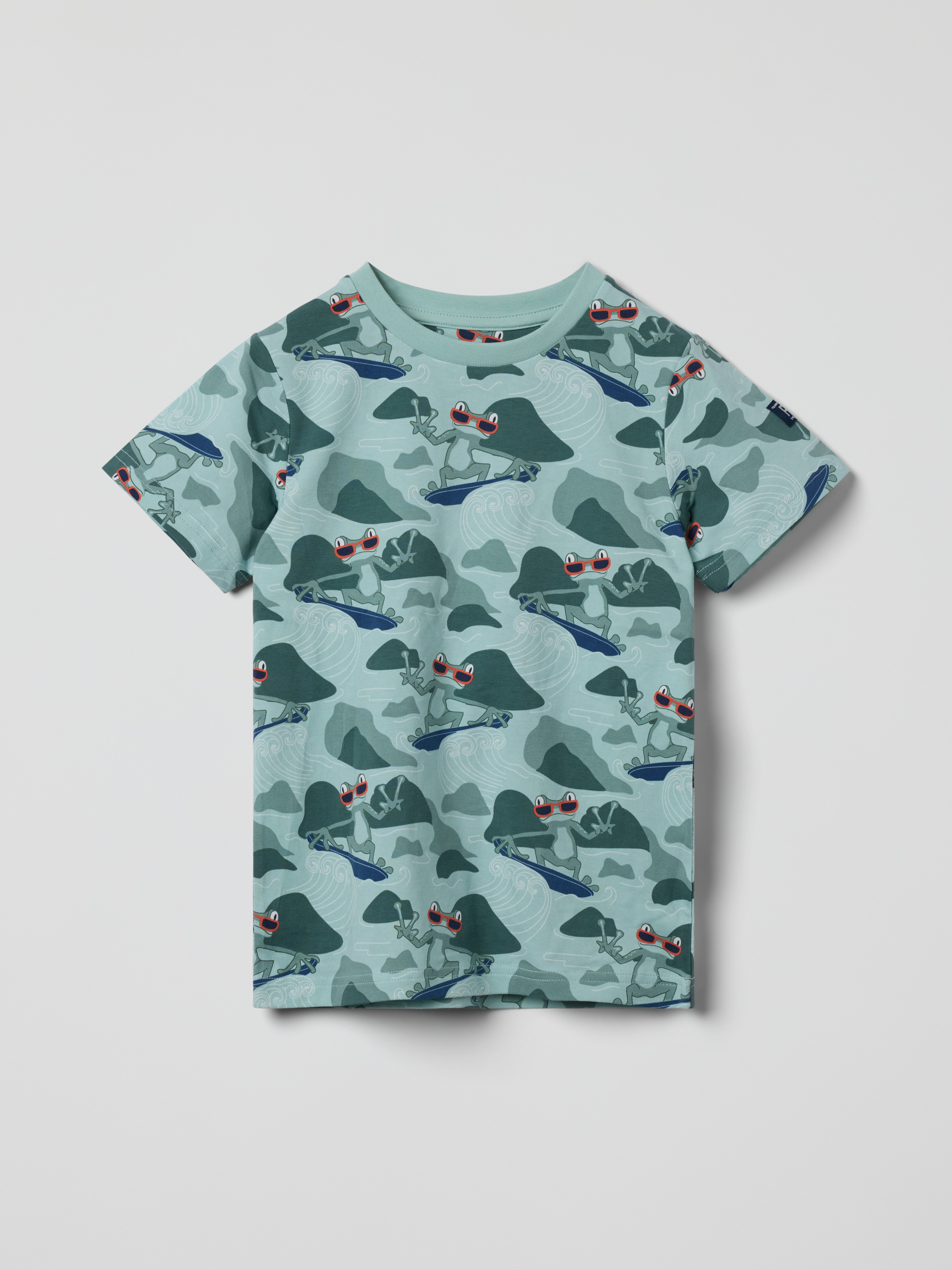 En mjuk och bekväm t-shirt för barn, tillverkad i ekologisk bomull. T-shirten är helmönstrad med söta grodor och passar perfekt till vardags.