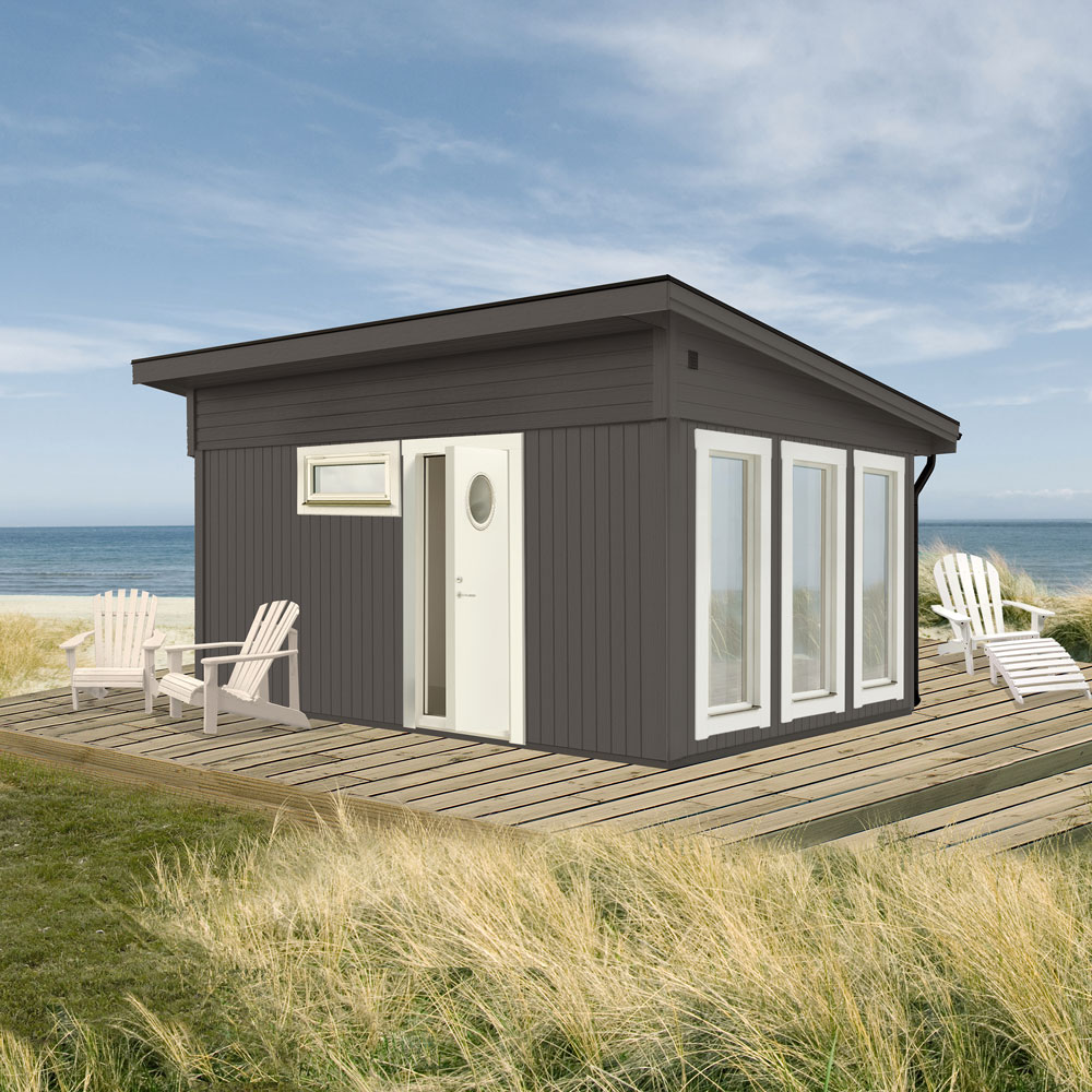 Hemmakontor, gäststuga eller hobbyrum? Stugan Elva från Vibostugan kan användas till det mesta. Stugan levereras som monteringssats vilket innebär att du får färdiga väggmoduler och gavelspetsar vid leveransen. De tre avlånga fönster som går från golv till tak ger gott ljusinsläpp. Även ett öppningsbart fönster ingår samt en dörr. Eftersom sektionerna kan flyttas har du möjlighet att placera både fönster och dörr på önskad plats. Storleken på 14,8 m² gör att stugan kan klassas som friggebod och därmed inte kräver bygglov. Stugan är obehandlad och måste grundoljas samt grund- och täckmålas innan användning. Detta gäller även fönster och dörr. Med byggsatsen följer en utförlig byggbeskrivning, steg för steg, hur du på bästa sätt bygger ihop din stuga. Är du händig klarar du det med våra instruktioner. Annars kanske det behövs en erfaren snickare till hjälp. Fönster 1 st öppningsbart fönster, obehandlad – 90 x 40 cm 3 st fasta fönster, obehandlad – 60 x 180 cm Dörr 1 st i obehandlad panel