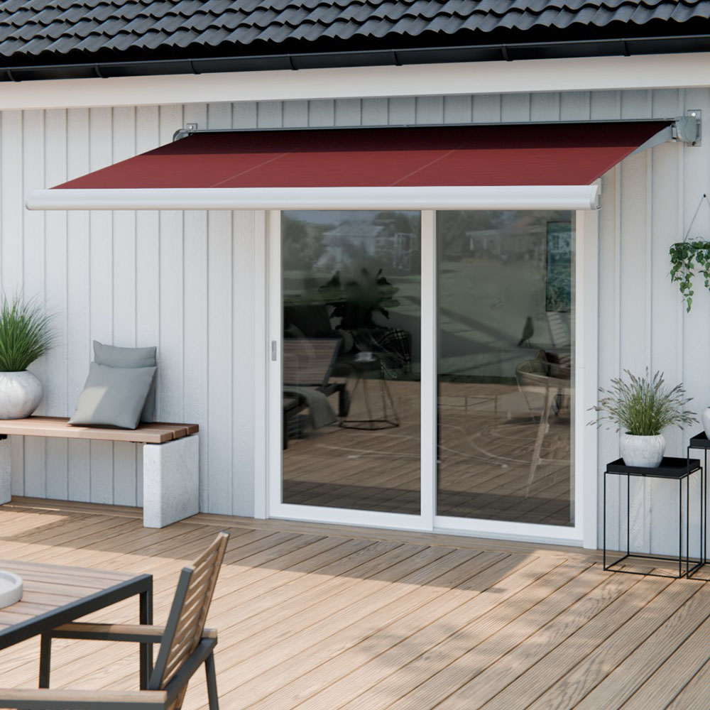 Denna terrassmarkis med helkassett skyddar din uteplats från sol och värme. Markisen är utrustad med en motor och fjärrkontroll för enkel användning. Den moderna väven är tålig mot UV-strålning och blekning.