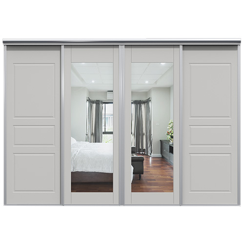 Detta skjutdörrsparti i lantlig stil ger en vacker och praktisk förvaringslösning. Dörrarna är justerbara i höjd och enkla att montera, med mjukstängande funktion och kullagrade hjul för tyst och stabil användning.