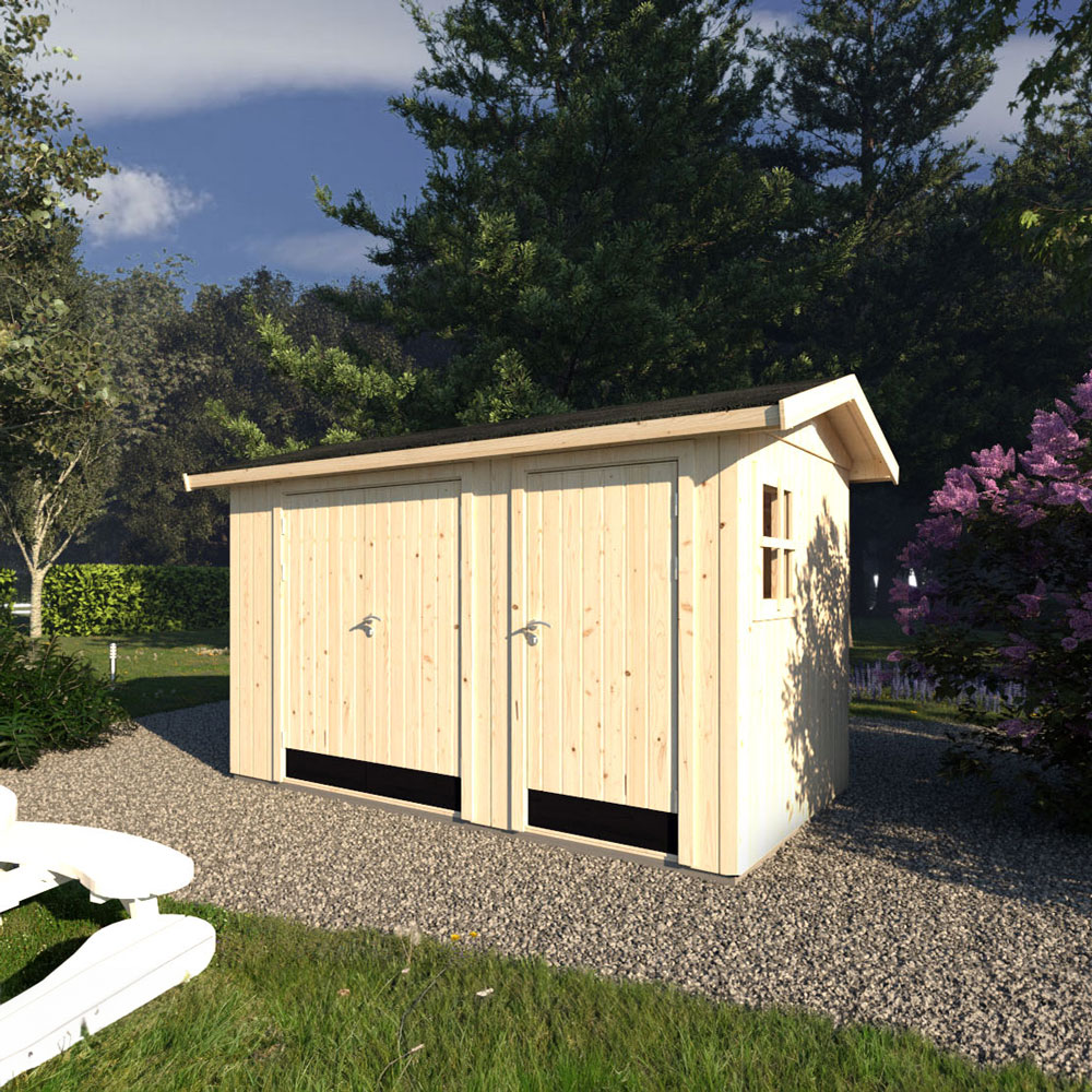 Detta förråd ger dig möjligheten att organisera din förvaring precis som du vill. Med en pardörr blir det enkelt att lasta in och ut större föremål, och det finns även ett mindre rum för trädgårdsredskap. Förrådet levereras som en byggsats med tydliga instruktioner för enkel montering.