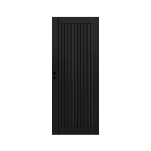 En modern innerdörr i svart med ett stilrent randmönster. Dörren är tillverkad med en ram i furu och en fyllning av honeycomb, vilket ger en lätt men stabil konstruktion. Den levereras med låskista och nyckel, redo för montering.