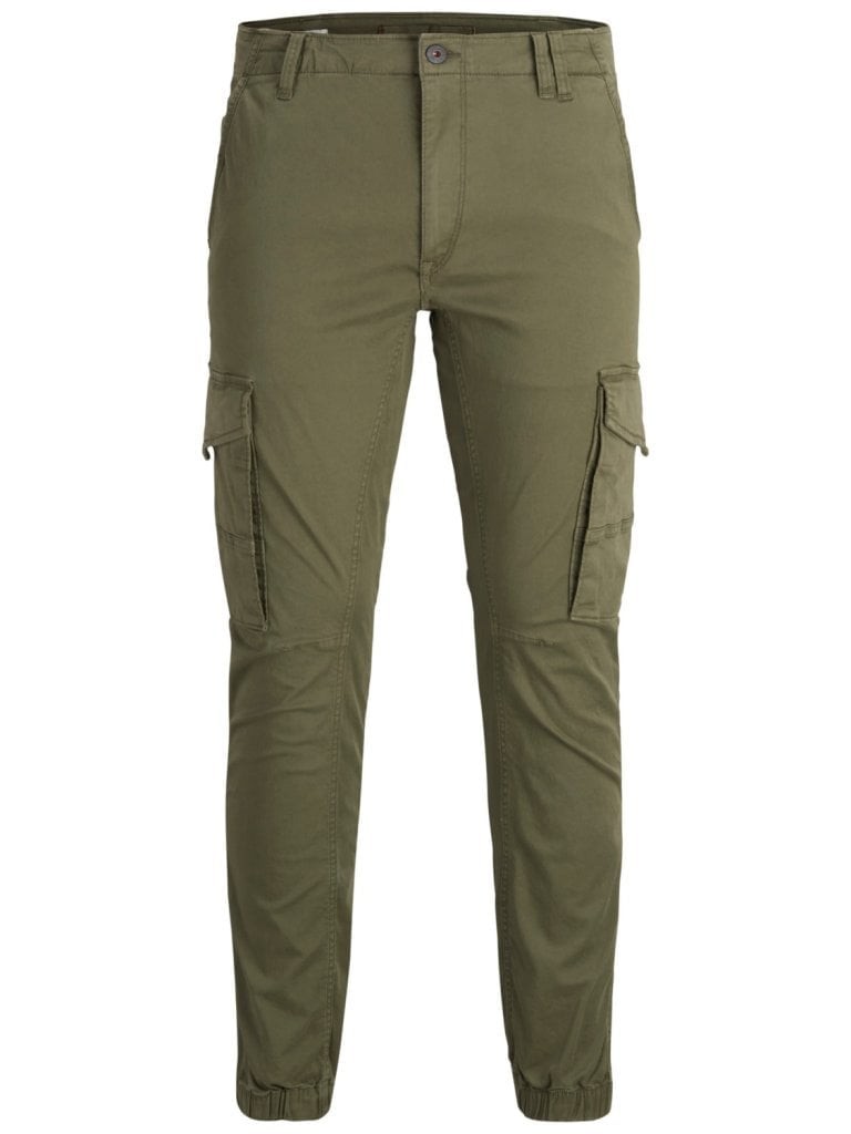 Dessa olivgröna cargobyxor har en modern och avslappnad stil med en avsmalnande passform och muddar vid anklarna. Tillverkade i ett stretchigt twilltyg för ökad komfort och rörelsefrihet, vilket gör dem perfekta för vardagsbruk.