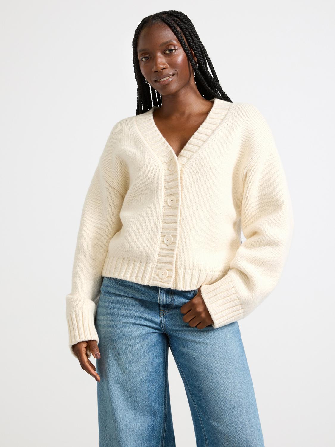 Denna mjuka, stickade cardigan har en ledig passform med vida ärmar och knappar framtill. Den är perfekt att slänga över sig under kyliga dagar eller som ett stilfullt lager på kontoret.