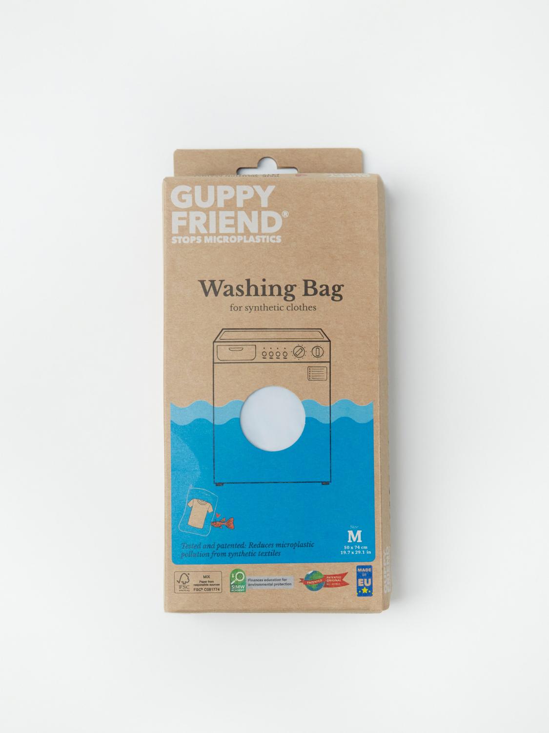 Guppyfriend tvättpåse minskar utsläppet av mikroplaster från syntetiska kläder under tvätt. Påsen fångar upp fibrerna så att de inte hamnar i haven. Använd den genom att lägga dina kläder i påsen och tvätta som vanligt.