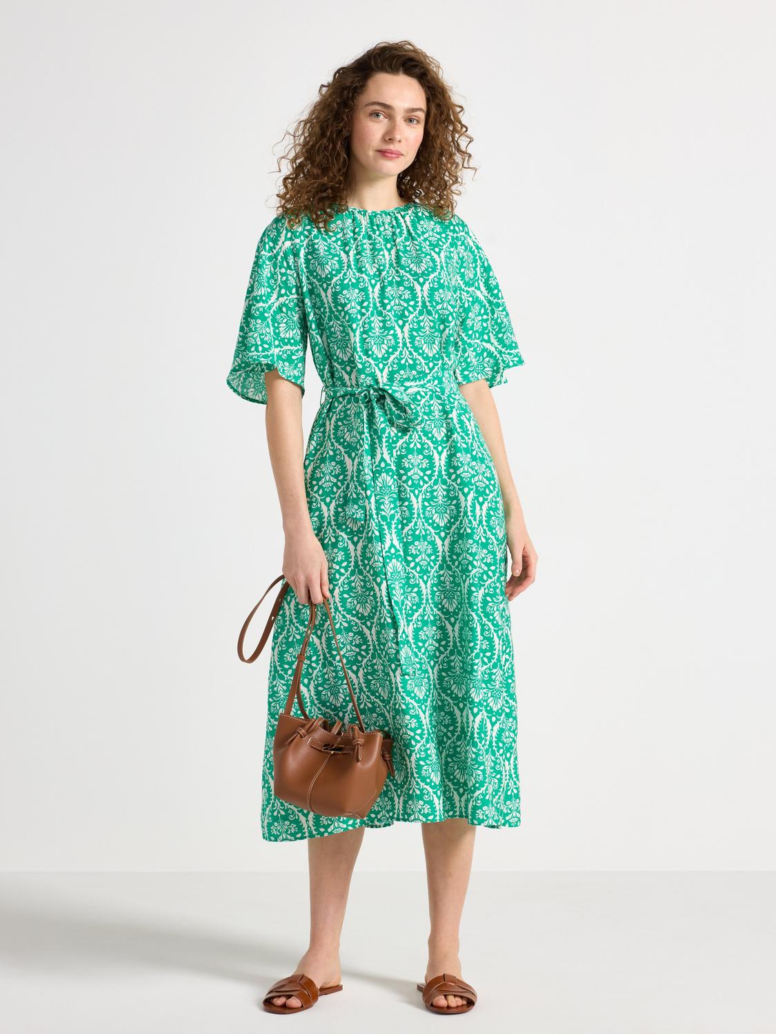 Denna midiklänning är tillverkad i ett vävt material och har en avslappnad passform. Klänningen har ett knytband i midjan som ger en smickrande silhuett. Perfekt för både vardag och fest.