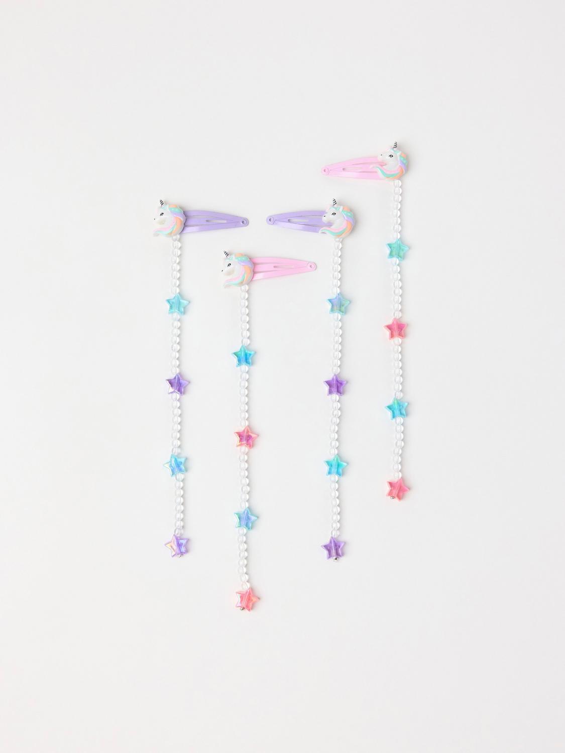 Ett set med fyra färgglada hårklämmor, dekorerade med söta enhörningar och långa pärlkedjor prydda med stjärnor. Perfekt för att piffa upp vilken frisyr som helst och ge en lekfull touch.