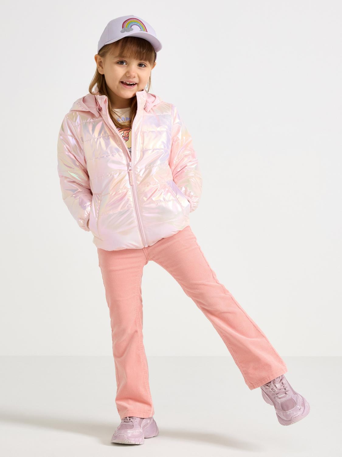 Denna glansiga, vadderade jacka håller barnet varmt under kyliga dagar. Jackan har en modern, holografisk finish som gör den extra speciell. Med dragkedja fram och avtagbar huva är den både praktisk och trendig.