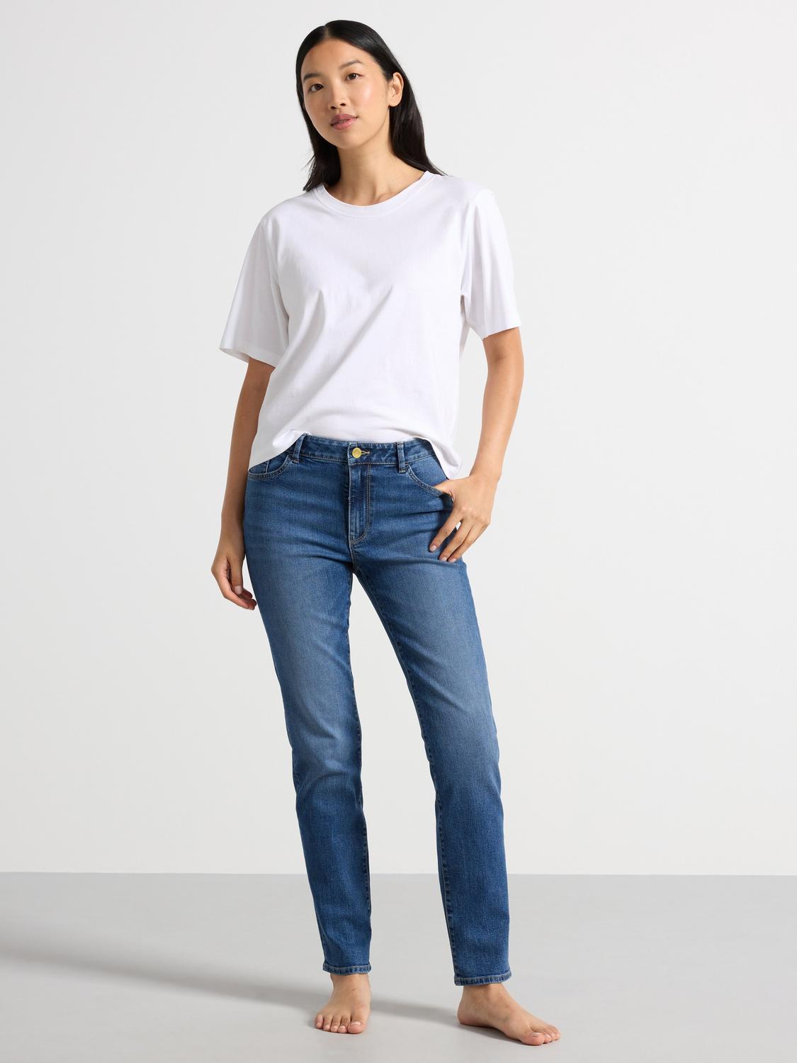 Dessa stretchiga jeans för dam har en rak passform och klassisk knappgylf. Materialet är mjukt och följsamt vilket ger en bekväm känsla hela dagen. Jeansen är tillverkade i en blandning av bomull och återvunnen bomull.