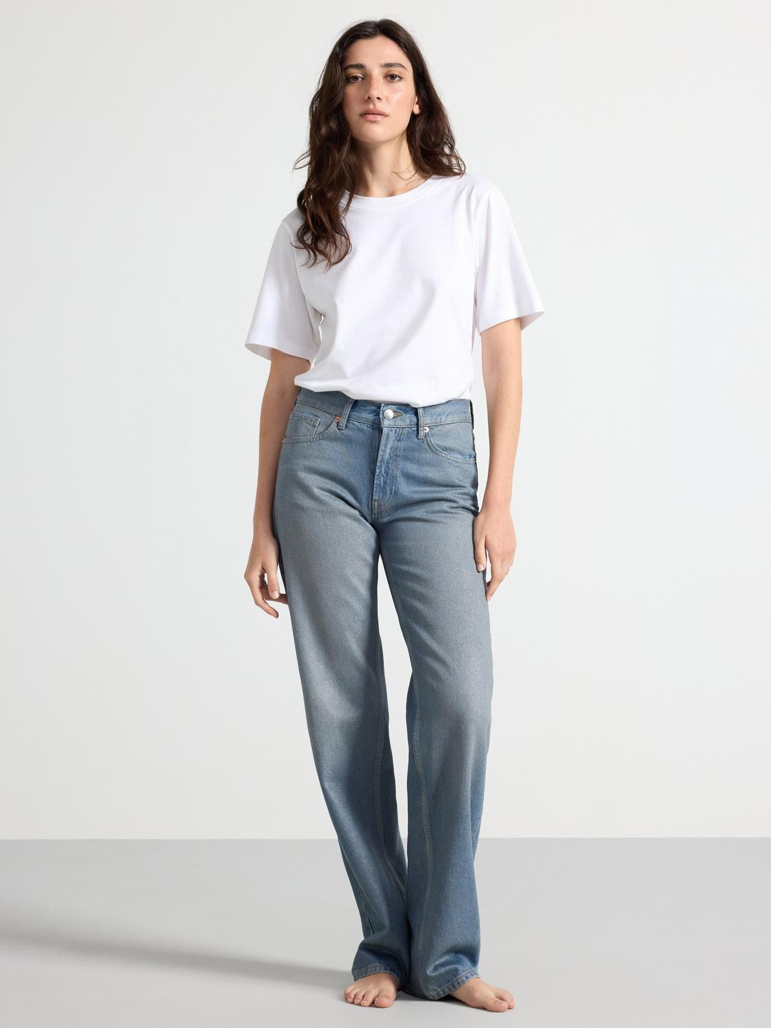 Dessa jeans har en silverskimrande coating och extra långa ben, vilket ger en unik och trendig look. De är tillverkade i stadig bomullsdenim och har en medelhög midja. Observera att de kan vara lite små i storleken, så det rekommenderas att välja en större storlek än vanligt.