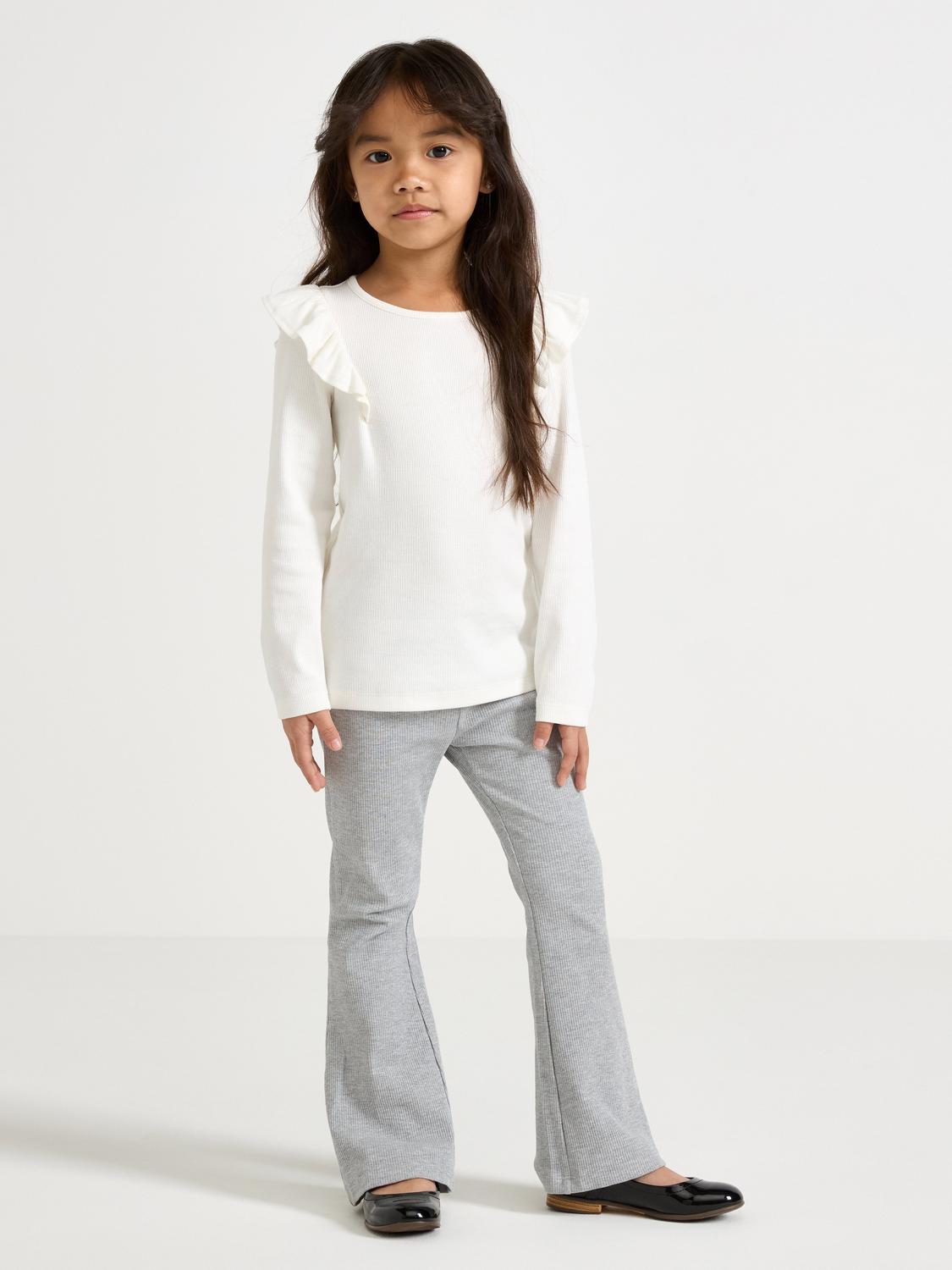 Dessa leggings är tillverkade i ett mjukt och bekvämt bomullsmaterial med en ribbad textur. De har en trendig utsvängd design vid bensluten, vilket ger en modern touch till barnets garderob.