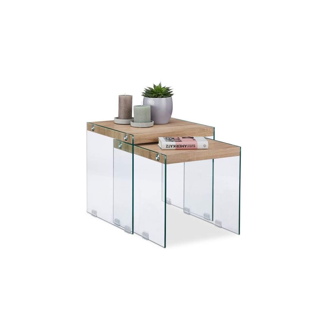 Dessa moderna satsbord kommer i ett set om två och passar perfekt i ett stilrent hem. Borden har glasben och en träskiva som ger en elegant touch. De kan användas tillsammans eller separat för att skapa en flexibel möblering.