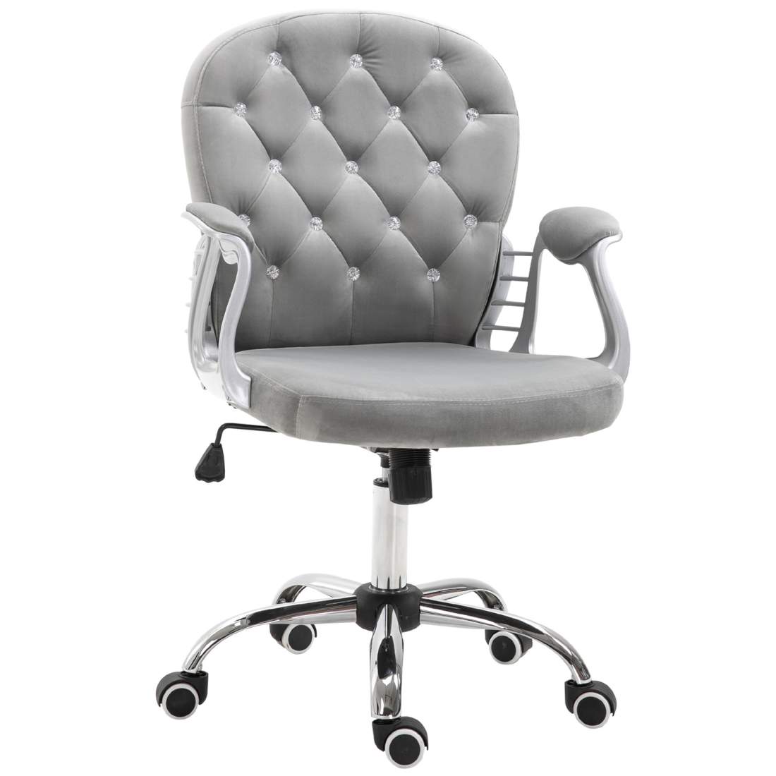 Denna grå kontorsstol kombinerar komfort med en elegant design. Med detaljer som dekorativa kristaller och ett mjukt sammetstyg, passar den väl in i hemmakontoret eller andra rum. Stolen är justerbar och har hjul för enkel förflyttning.