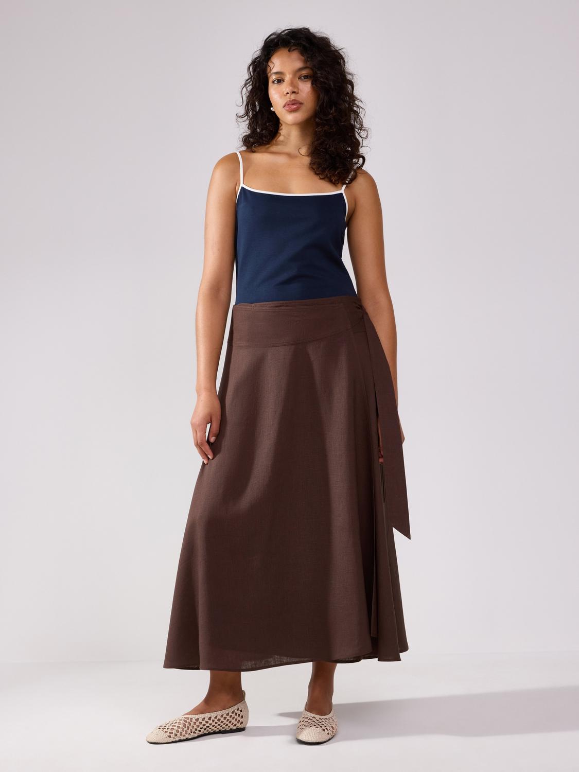 En kort omlottkjol med en smickrande passform. Kjolen har insnitt bak för extra struktur och en vikt fåll som ger ett fint fall. Denna minikjol har en mid-midja och knyts enkelt ihop.