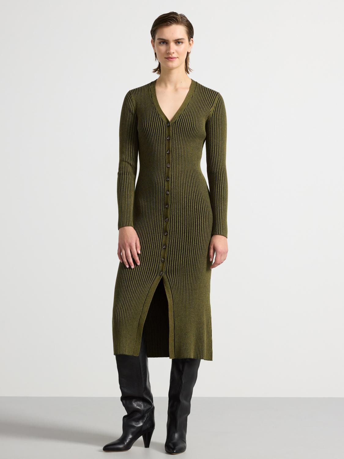 Denna ribbade midiklänning har en smickrande, figurnära passform och långa ärmar, vilket gör den perfekt för både vardag och fest. Knapparna framtill ger en extra touch av elegans.