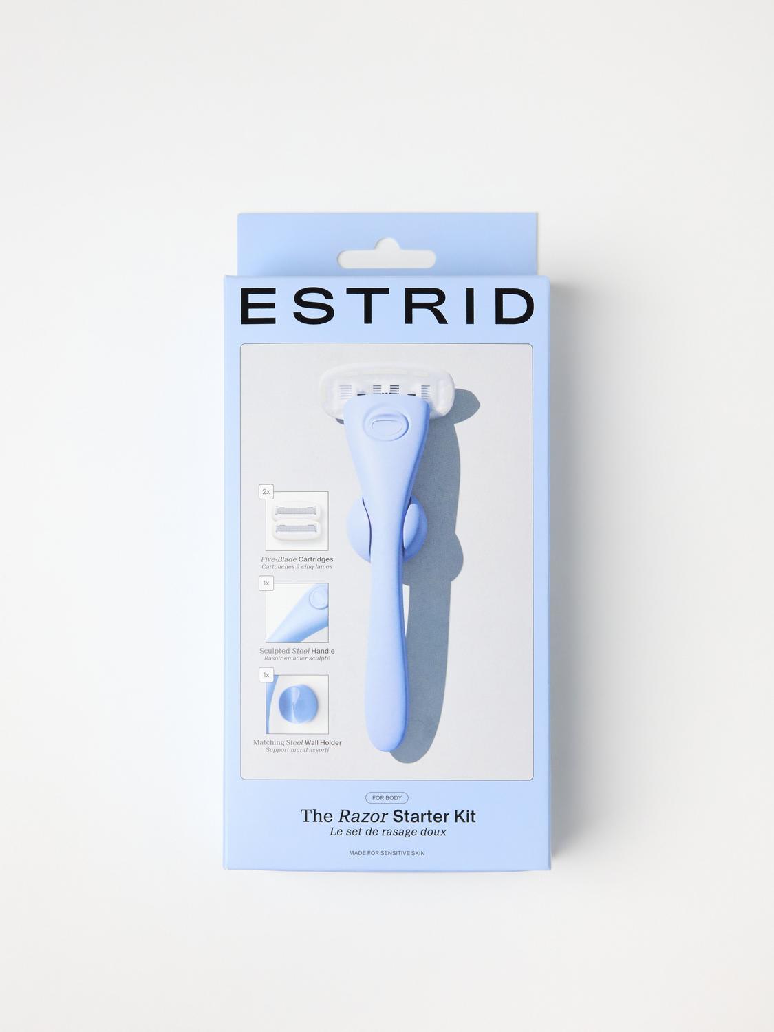 Estrid startkit ger dig en behaglig rakupplevelse. Kittet innehåller ett stilrent rakhyvelhandtag i stål, en praktisk vägghållare och två 5-bladiga rakblad för en nära rakning.