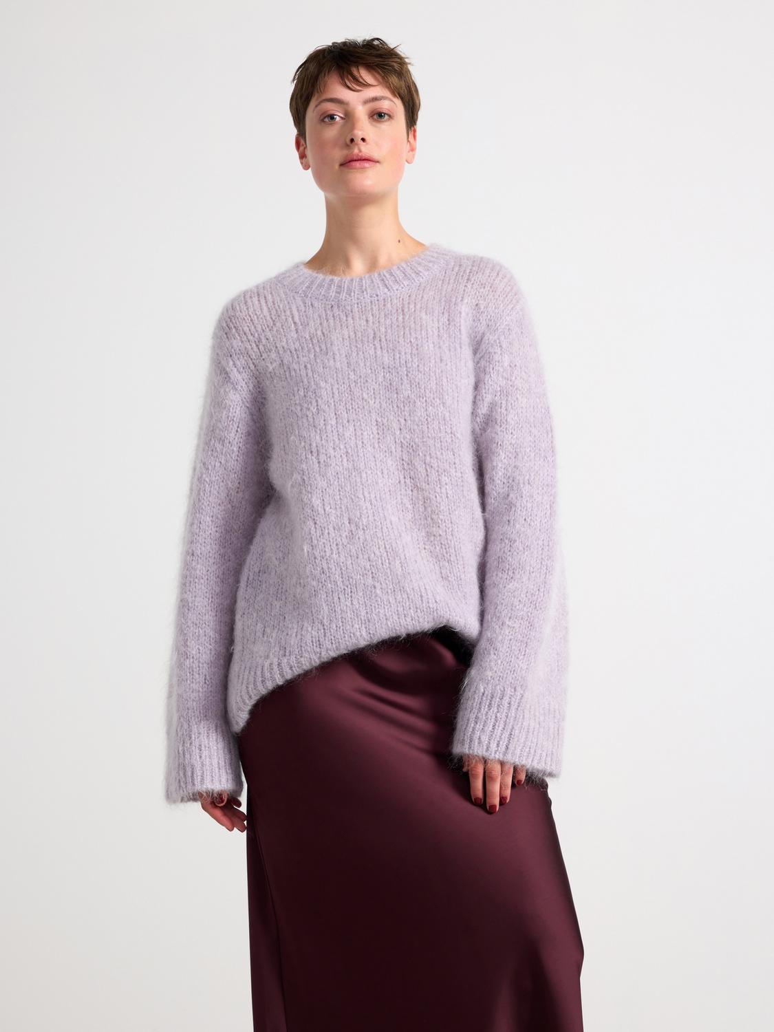 En mjuk och skön stickad tröja i mohairblandning. Tröjan har en ledig, oversized passform och en rund halsringning, vilket gör den bekväm och lätt att bära.