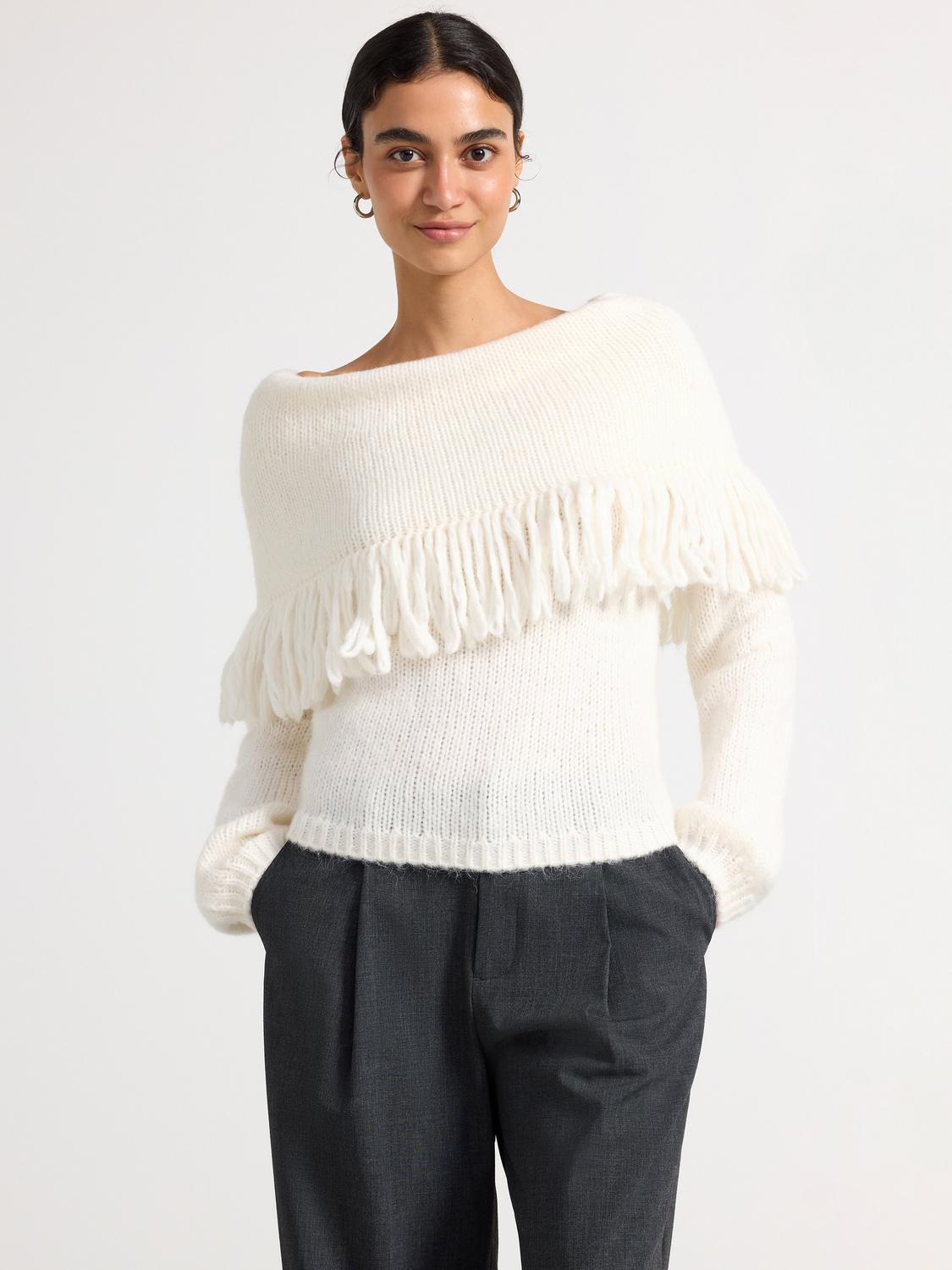 Denna mjuka, stickade tröja har en avslappnad off shoulder-design och en trendig fransad kant. Perfekt för mysiga dagar hemma eller en avslappnad utekväll.