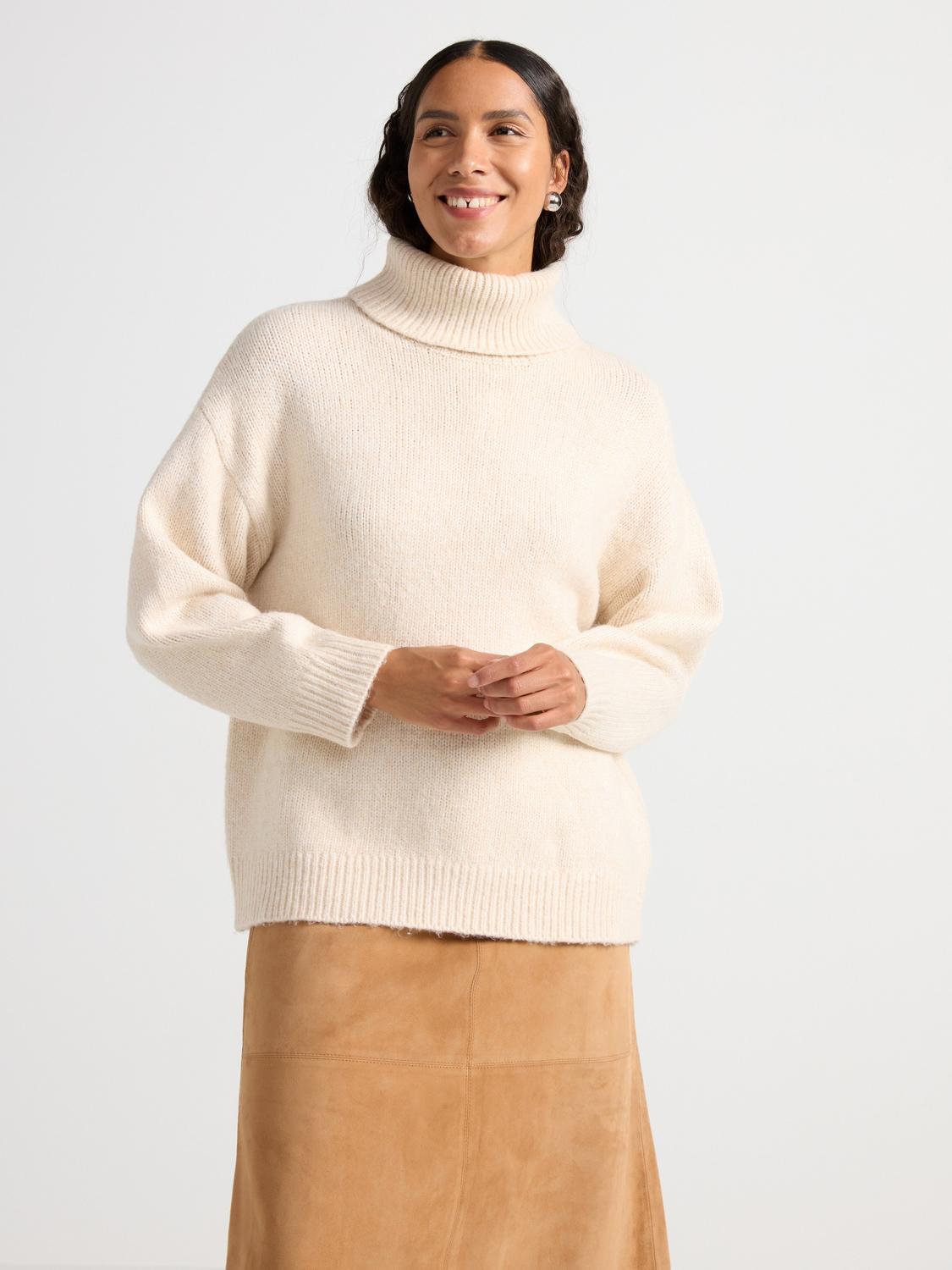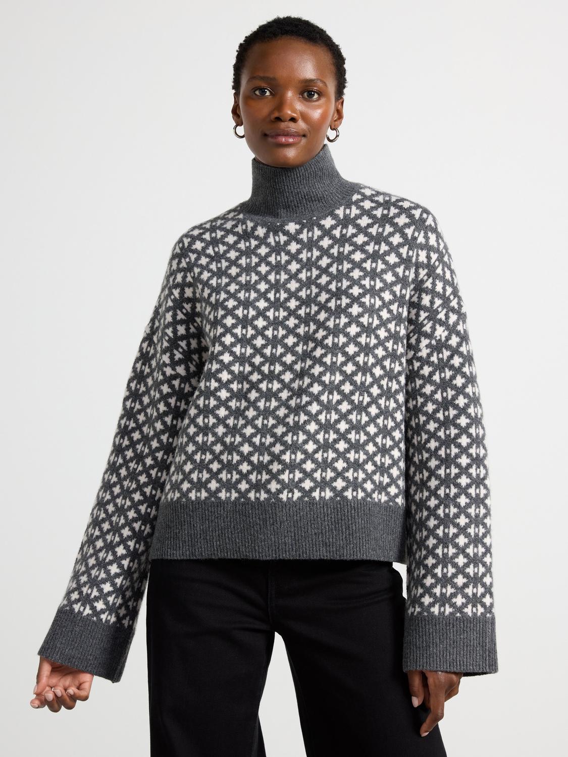 Denna jacquardstickade tröja har en hög polokrage och vida ärmar, vilket ger en avslappnad men stilfull look. Tröjan är perfekt för kyligare dagar och kan enkelt kombineras med både jeans och kjol.