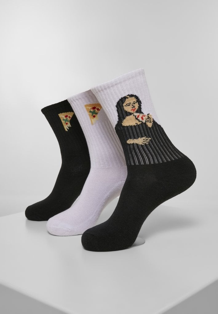 Detta 3-pack strumpor från Arti bjuder på en unik design med pizzamotiv. Setet innehåller tre olika par: ett par svarta med pizza slice, ett par vita med pizza slice och ett par svart/vita med Mona Lisa som äter pizza. Strumporna är tillverkade i en blandning av bomull, polyester och elastan för optimal komfort.