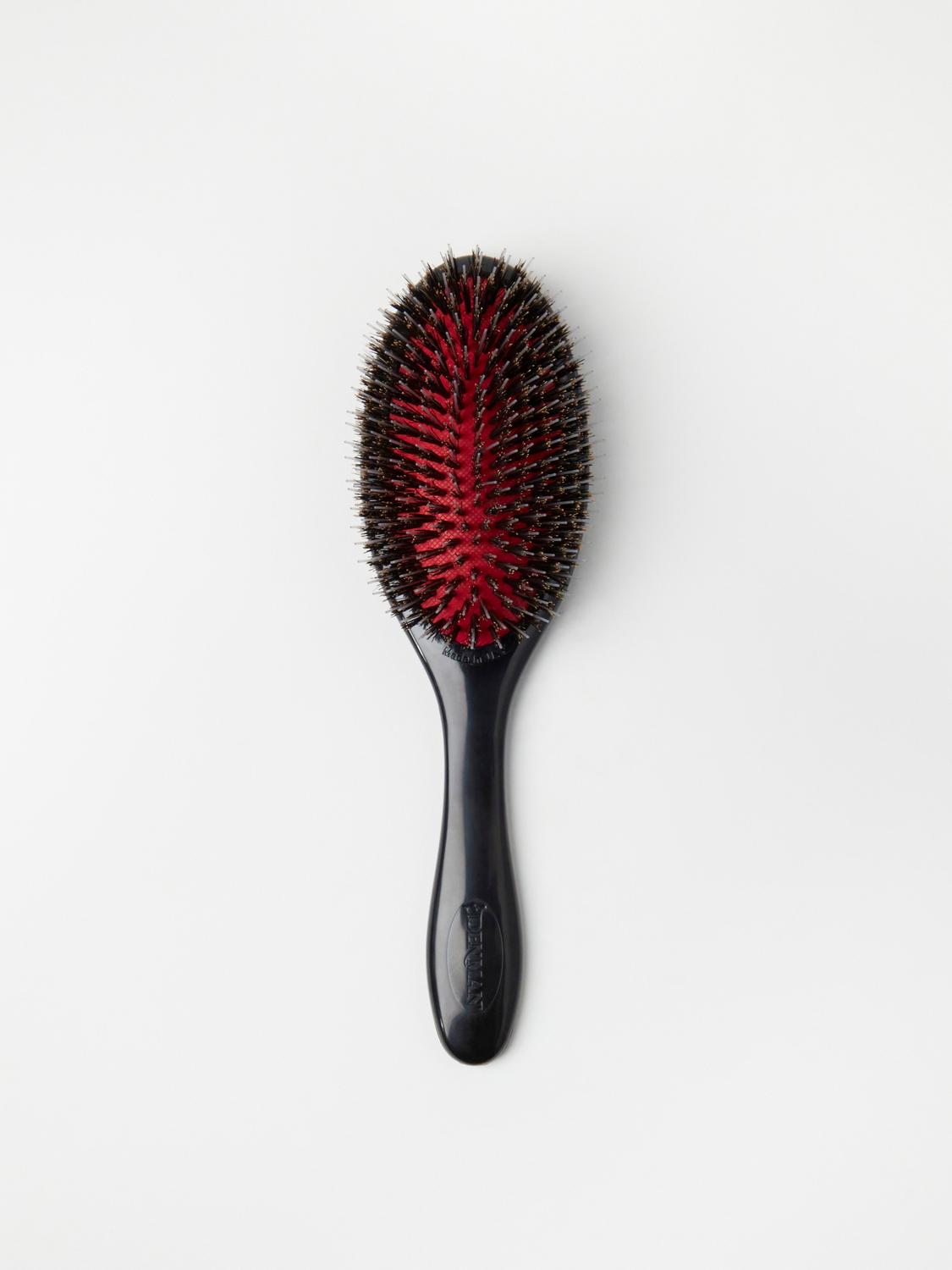 Denman The Style & Shine Medium är en hårborste som kombinerar naturliga borst och nylonpiggar. Den är utformad för att reda ut håret, skapa form och ge en fin lyster. Borsten har en luftkudde som gör det enkelt att borsta igenom håret.