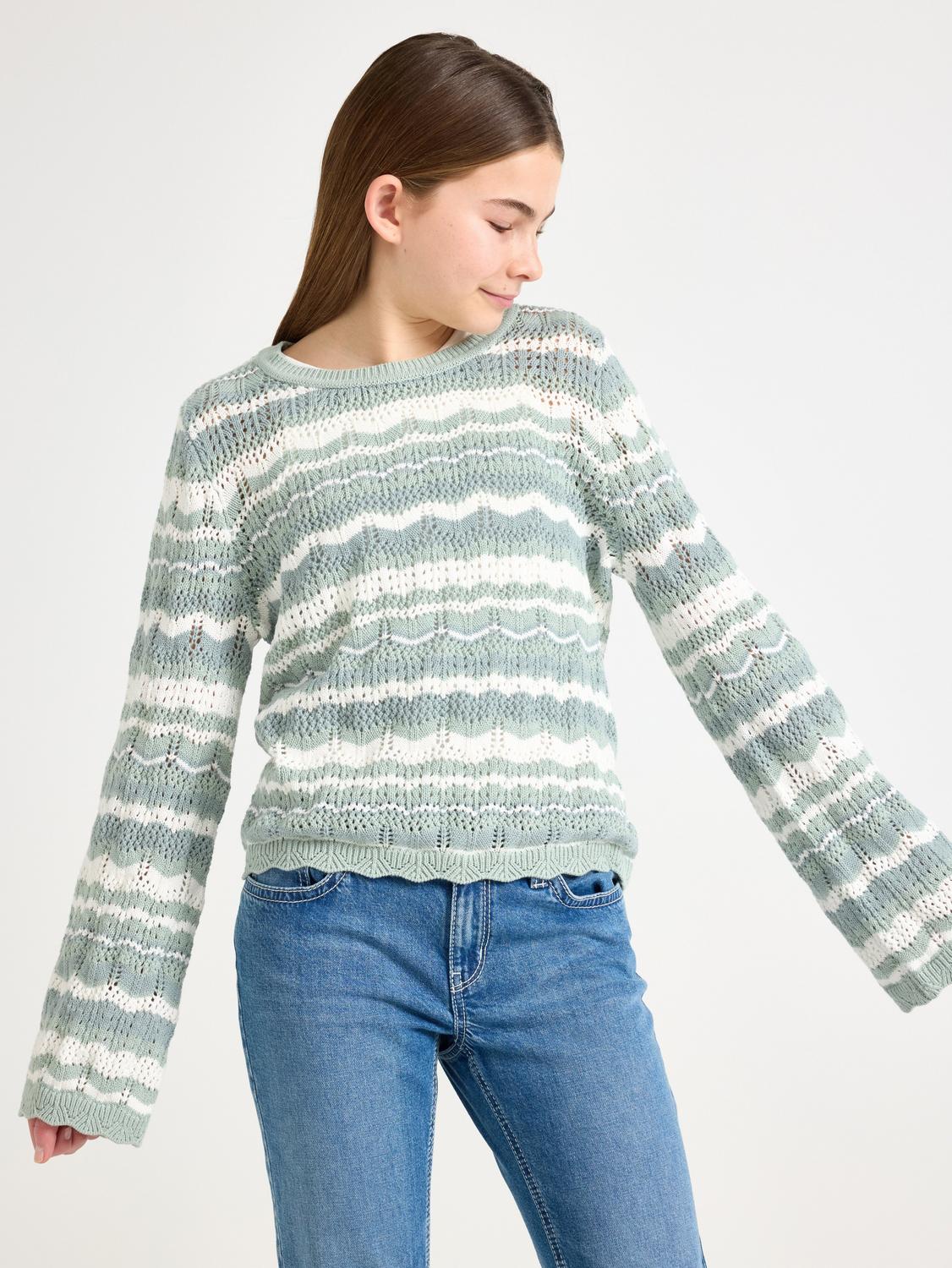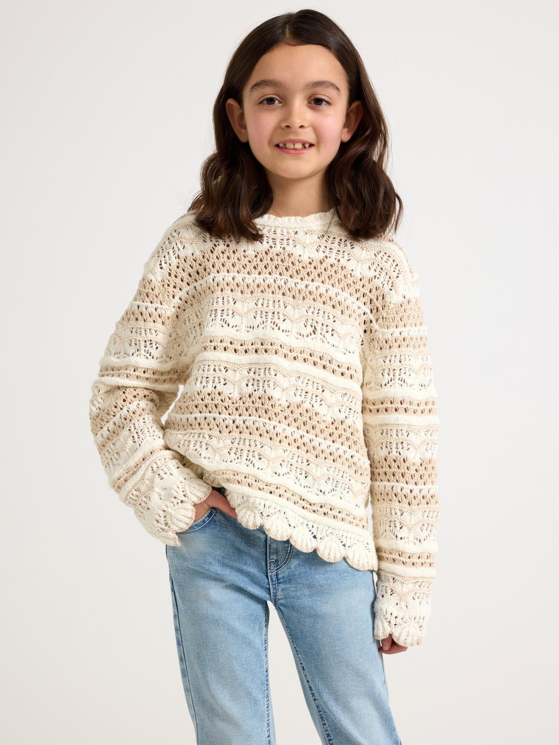 En söt och mjuk tröja för barn, stickad i ett fint pointellemönster. Tröjan är gjord av behaglig bomull och har vågiga kanter som ger den en extra charmig detalj.