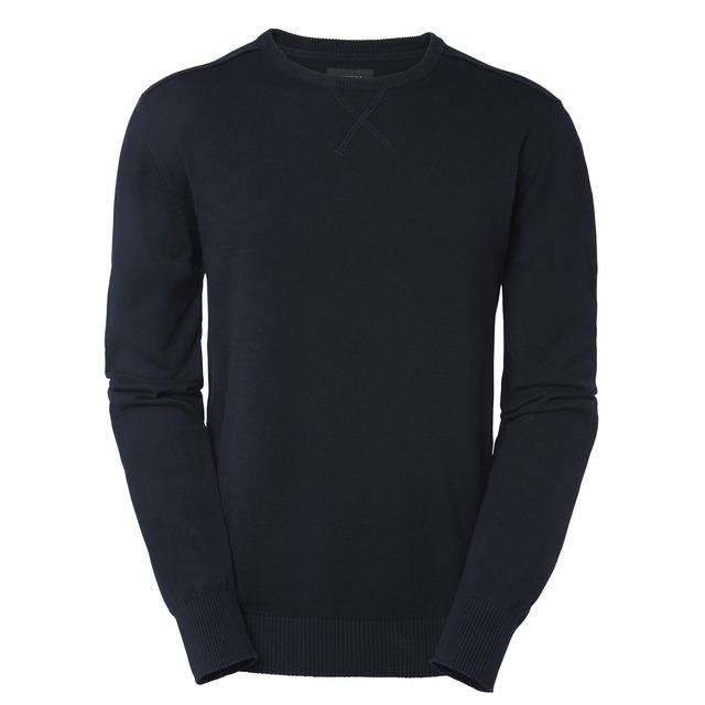 En finstickad tröja i mörk marinblå färg med rund hals och ribbad ringning. Tröjan har dekorativa flatlockstickningar och piping i axelsömmarna. Armbågspatcharna har en kontrasterande stickning.