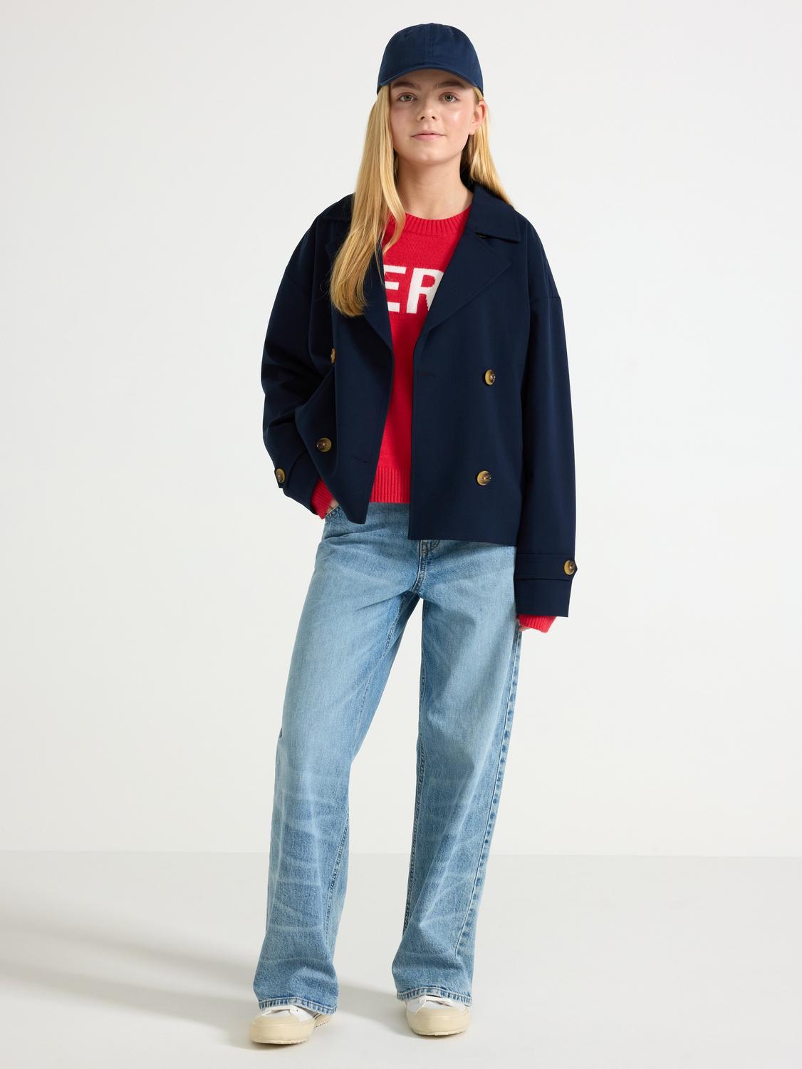 En modern och stilren trenchcoat i croppad modell, perfekt för barn och ungdomar. Jackan har en klassisk dubbelknäppning och praktiska fickor framtill.